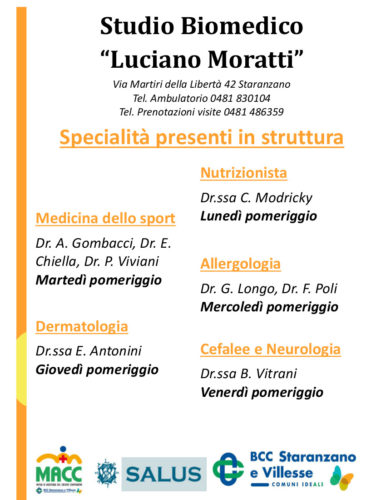 Nuova specialità in studio Moratti! E con ottobre sono ormai sei le specialità presenti nel nostro Studio Biomedico Moratti, struttura gestita da Salus Policlinico Triestino Spa e coordinata dalla MACC d’intesa con la BCC di Staranzano e Villesse. Oltre alle ormai “storiche” dermatologia, medicina sportiva e ambulatorio nutrizionistico, proseguono anche le visite allergologiche e cardiologiche. Novità autunnale per tutti gli utenti è invece la presenza del dott. Nerio Masè, già Primario del reparto di riabilitazione della struttura Pineta del Carso di Aurisina e oggi a disposizione dei soci MACC, BCC e di tutti gli interessati ad avere un consulto fisiatrico…. Continua a leggere